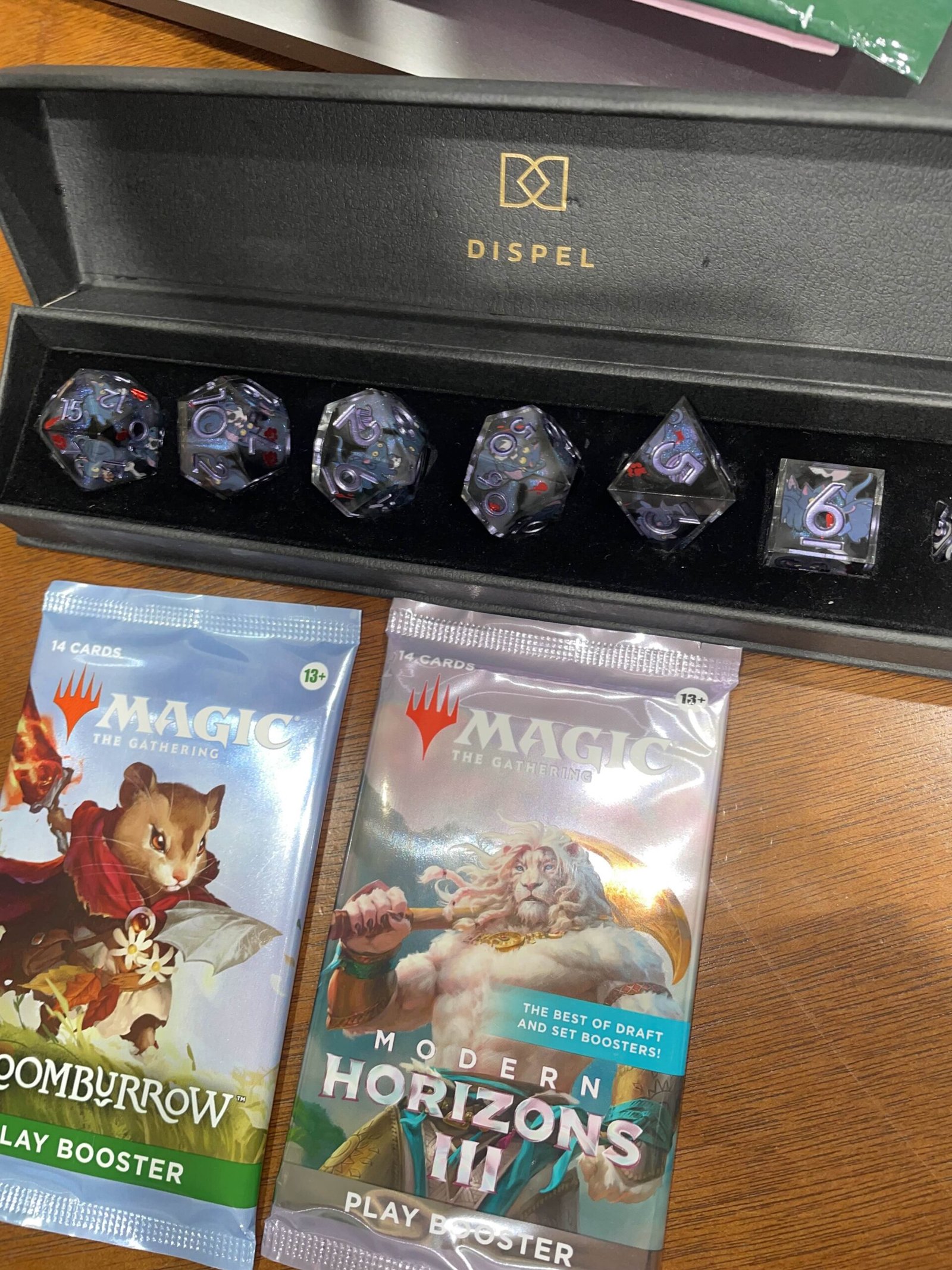 Next stop on the birthday train was to my local game store, and I picked up some Magic: The Gathering cards. Aydan went above and beyond and got me the best dice set I’ve ever seen!