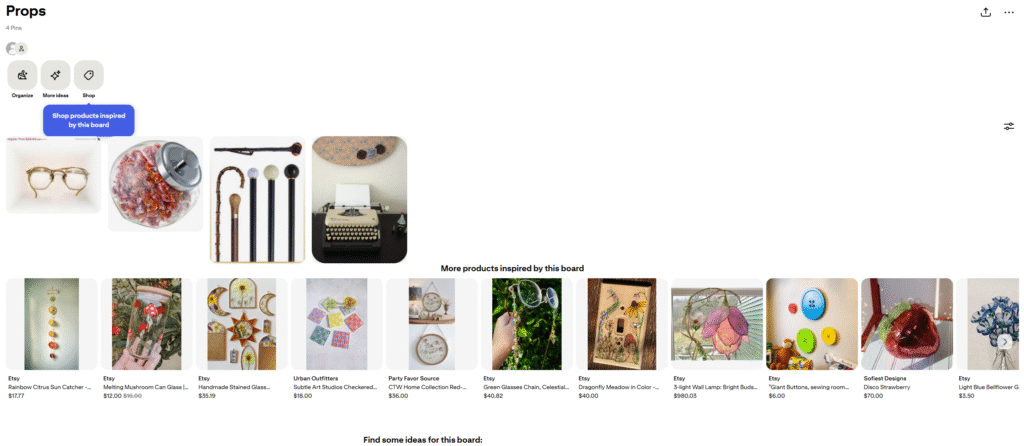 A pair of spectacles, old candy in a jar, an assortment of canes because I didn’t want be specific, and a typewriter. I really was not always a good student. “Props” is the only board I have on Pinterest, and it’s TWELVE YEARS OLD. I just checked, and the glasses used to be part of an Etsy shop, which has since been shut down. The glass jar also had its own website, and though you can no longer buy the item, they can still get traffic from Pinterest to go to their main site through that image. This is the really cool part though, because you create tags to put on your Pinterest boards and pins, people look it up, and can then get redirected to whatever website you’ve set up for it.